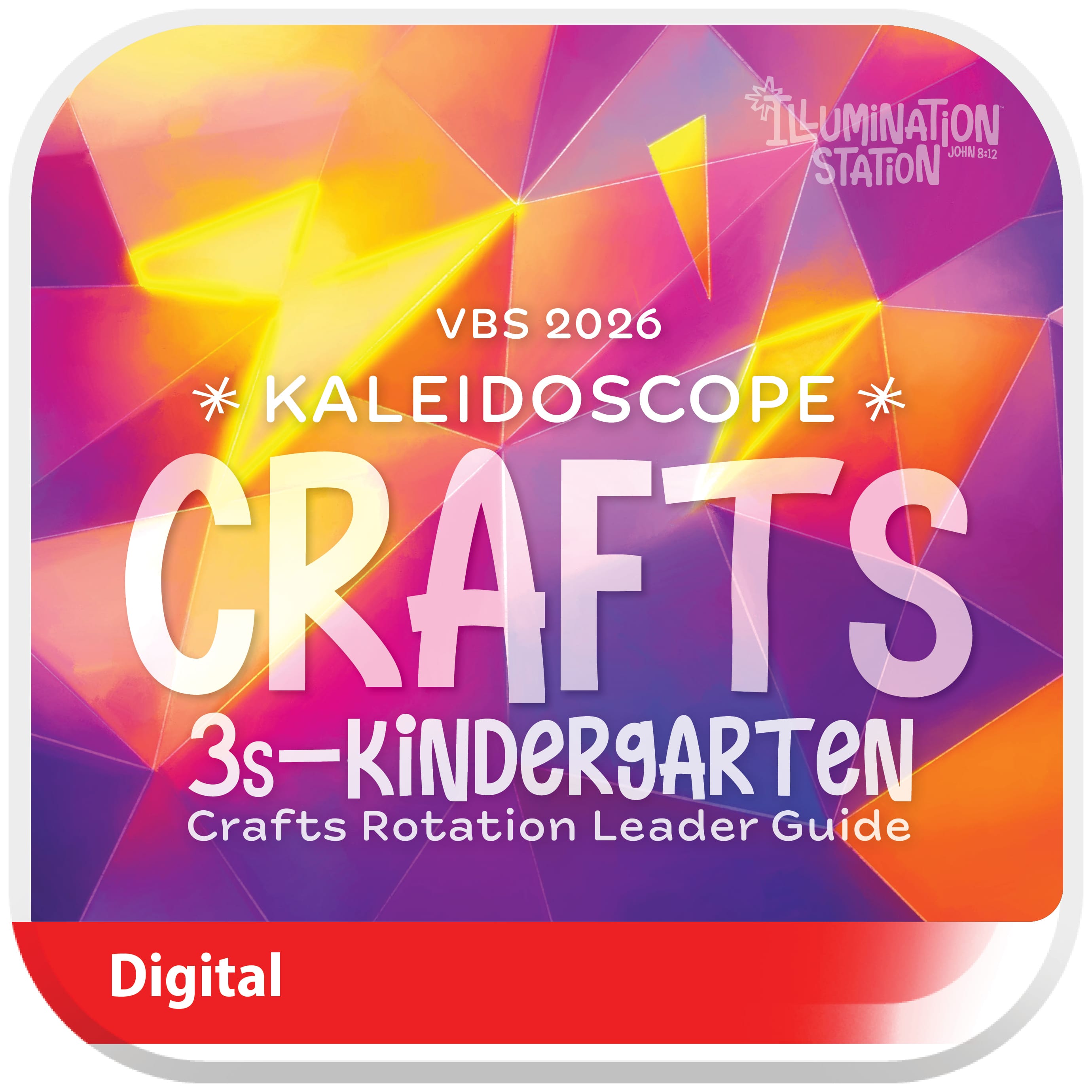 The VBS 2026 3s–Kindergarten Craft Leader Guide Digital, the digital version of the 3s–Kindergarten Craft Leader Guide, provides 16 themed craft ideas for Illumination Station with step-by-step instructions.