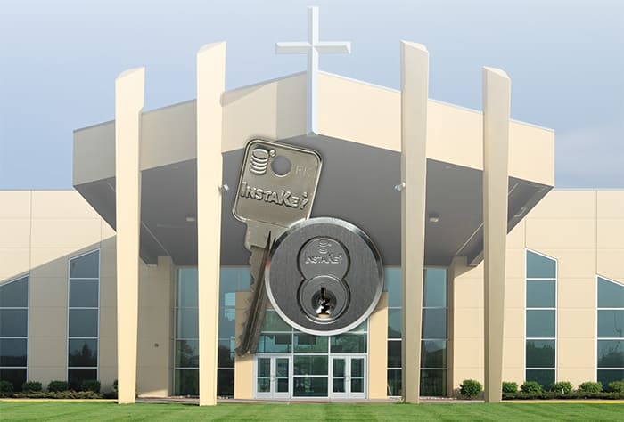 Intakey's keys are restricted, which means they cannot be duplicated, so you can rest assured that five keys won't turn into six without your knowledge or authorization – enhancing church security. If someone changes their role within the church or moves away, getting the key back upon their departure makes it possible to simply reassign the key to another key holder without risking security and without the need to change the locks.If a key is not returned or if a key goes missing, there is no need to call a locksmith. Their unique key system allows administrators to change locks and regain control of security with just the turn of a key. An entire system can be rekeyed immediately and at a fraction of the cost of a locksmith's services. Secure church exteriors, offices, classrooms, utility closets, outbuildings, and other spaces all on the same key system. Pastors, administrators, staff and other key holders can access the spaces they need access to with fewer keys to carry around, when you implement a master key system. InstaKey can also provide fulfillment of non-InstaKey small format interchangeable core (SFIC) systems along with exit devices, cipher locks, door hardware and locksmith services. View the InstaKey Line Card.