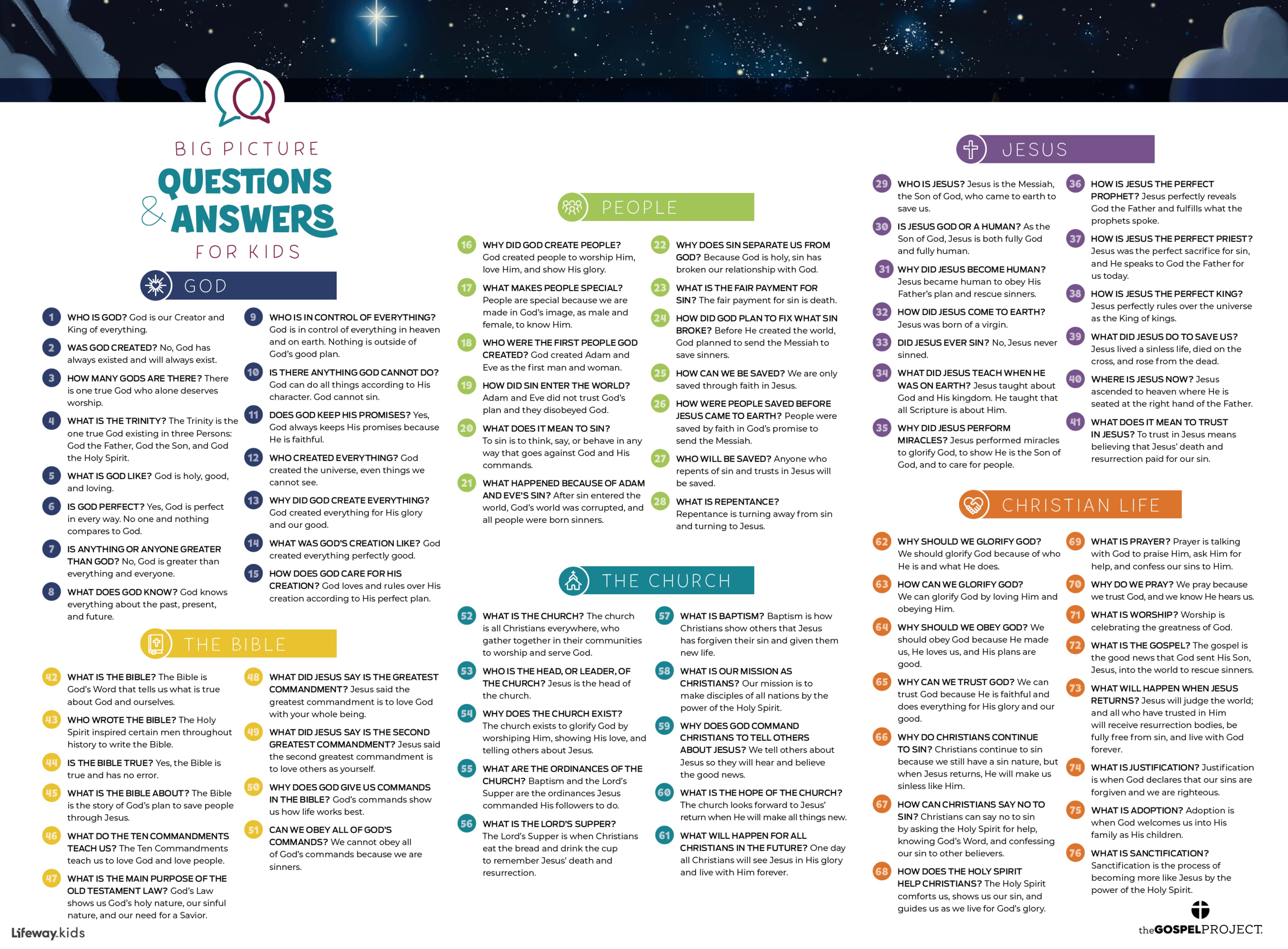 Preschoolers and kids will systematically learn theological concepts through 76 questions and answers around six overarching categories.